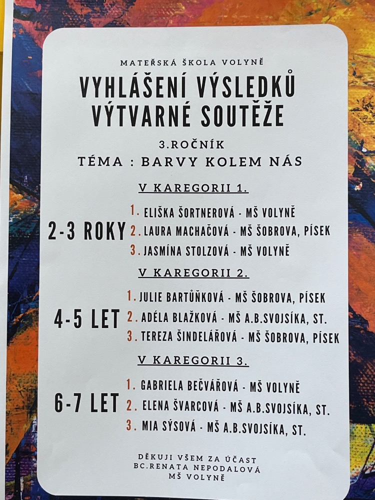 - 3. místo Mia Sýsová " Barevný den" ze třídy Krtečků